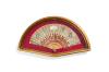 Con varillaje en madera tallada y calada con decoración de motivos vegetales y florales, pais en tela con aplicación de lentejuelas y cartela central con figuras mitológicas.