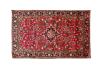 Alfombra persa en lana con motivo romboidal central y motivos vegetales y florales sobre campo rojo.
