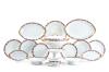 Se compone de: 36 platos llanos, 12 platos hondos, 11 platos de postre, 1 frutero con pie, 2 fuentes circulares con pie para tartas,, 4 entremeseros, 1 salsera con su plato, 2 fuentes ovales en tamaño degradé, 1 sopera y 1 fuente grande redonda.