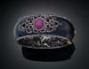 Realizado en oro de 18 k, plata y resina. Diseño rígido con aplique vegetal, diamantes talla 8/8 engastados en grano con un peso total de 5,06 cts. Rubíes en talla cabujón, con un peso estimado de 9,60 cts.
