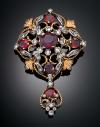 BROCHE, COLGANTE ANTIGUO CON DIAMANTES Y GRANATES EN ORO AMARILLO DE 18 K Y PLATA