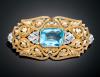 Realizado en oro amarillo de 18k y vistas en platino, diseño modernista con espinela sintética y diamantes.