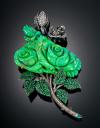 Realizado en plata, diseño de rosas en turquesa con un peso estimado de 107.48 cts, capullos y tallo cuajados en diamantes con un peso total aproximado de 4.46 cts, hojas con granates tsavoritas engastados en pavé peso aproximado de 0.21 cts, tallo rematado con una esmeralda talla pera de 0.2 cts. Cierre de alfiler en oro de 18 K.