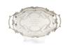 Bandeja oval con asas en plata española punzonada con decoración grabada.