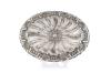 Campo gallonado y alero de rocallas y flores. Umbo relevado con decoración de tornapuntas.