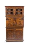 Doble cuerpo de palillería y bargueño sobre taquillón. Decorado con marquetería de maderas frutales y ebonizadas. Con importante blasón real que muestra partido verticalmente, por un lado una torre y por el otro un león rampante, emblemas clásicos de los reinos medievales de Castilla y León, y aparecen juntos desde la unión de ambos reinos en el s. XIII. En el campo derecho aparecen tres lises, emblema tradicional de la Casa de Borbón. Herrajes en hierro.