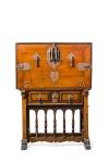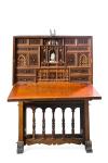 En madera de nogal ebonizada y en su color y aplicaciones de hueso pirograbado. Tapa frontal abatible con herrajes en hierro calado y aplicaciones en terciopelo. Sobre pie de puente