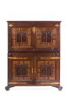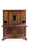 Presenta dos cuerpos; el superior con puerta abatible e interior de frente arquitectónico con capilla central flanqueada por cuatro calles de cajones horizontales con secretos y dos gavetas en los ángulos inferiores y el inferior a modo de taquillón cerrado, con dos puertas articuladas mediante bisagras de bronce dorado, apoyado sobre patas de garra y bola. Con llave
