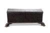 Baúl antiguo encorado y tachuelado. Herrajes en hierro forjado.
