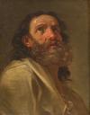 Las representaciones de santos en formatos medianos, en busto, eran muy típicas en el catálogo pictórico de Guido Reni, ejemplo de ello lo tenemos en una obra del mercado de anticuariado en Londres (71,1 x 52.7 cm.), San Pedro, del Hermitage Museum; San Lucas, Fundación Casa de Alba, San Pedro, Museo Nacional del Prado,… e incluso las representaciones de su Ecce Homo, del Staatliche Kunstsammlungen, Gemäldegalerie de Dresde, tiene relación con los “retratos” de estos santos. Todos ellos, al igual que sus santas, tienen en común la representación de busto, el fondo monócromo, negro o tonos verdosos amarronados, telas con ciertos volúmenes en los plegaos o de un solo color o dos, en el caso de haber manto, pero, sobre todo, la posición o giro de cuello que hace que la cabeza mire hacia arriba y los ojos busquen el mundo espiritual, como esperando una respuesta del cielo. Muchas de estas representaciones son bocetos o modellini para lienzos de mayor formato. En este caso podría ser la representación de apóstol y, como en otros, no es necesario pintarlo con sus símbolos parlantes. Por la soltura en la pincelada, muy fluida y segura, no estamos ante una pintura para venta, sino, como hemos dicho, seguramente ante un modellino para estar en el taller de Reni, quizás pintada en la década de los años 30, cuando el clasicismo boloñés de Reni evoluciona hacia una pintura más madura, tanto en el uso del color, que no depende tanto del dibujo, y en la manera de aplicarlo, mucho más suelto y dinámico, sin ser tan purista en su acabado. Procedencia: Colección privada, Madrid