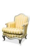 Butaca estilo Luis XV de la firma Polihome en madera color plata y tapicería a rayas.
