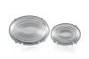Juego de dos salvillas ovales en metal plateado con decoración repujada de greca clásica en su perímetro y de retícula en el campo. Apoya sobre patitas en forma de mascarón con motivos vegetales.