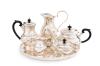 Juego de café en plateado sobre bandeja circular de Christofle formado por: catetera, tetera, azucarero y jarrita con marcas de Fleuron. Se añade jarra en plateado.