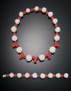 Realizado en oro amarillo de 18 k. Diseño formado por flores y hojas alternas en coral rojo y blanco engastado en garras, con un peso total estimado de 46,90 gr. Diamantes talla brillante, con un peso aproximado de 0.23 cts. Una estimación de color y pureza: G-H/VVS1-VVS2.