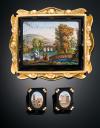 Conjunto micromosaico Florentino antiguo de la Huida a Egipto engastado en un marco de oro de 18 K. Pendientes con escenas de arquitecturas clásicas también sobre micromosaico. Montura en oro amarillo de 18k.
