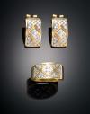 CONJUNTO FORMADO POR PENDIENTES Y SORTIJA EN DISEÑO GEOMÉTRICO CON PIEDRAS INCOLORAS EN ORO AMARILLO DE 18 K