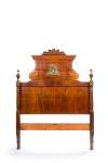 Con decoración en copete de marquetería de motivos florales y de aves, medallón central en bronce.
