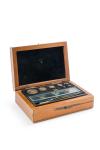 Cajita en madera con instrumentos de pesado.
