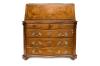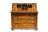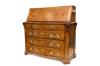 Tapa frontal abatible que muestra un interior con gavetas y cajones, cuatro registros de cajones de frente sinuoso, siendo el superior doble.