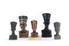 Cinco reproducciones de bustos de Nefertiti de diferentes tamaños y materiales.