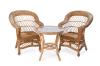 Conjunto de jardín en mimbre. Compuesto por dos butacas y mesa circular.