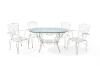 Conjunto de jardín formado por mesa oval con tapa en cristal y cuatro butacas en forja pintada en blanco. Francia, C. 1970.