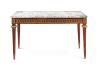 En madera, patas troncocónicas acanaladas, aplicaiones en dorado y sobre de marmol.