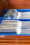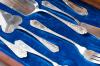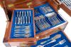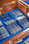 Con iniciales grabadas. Formada por: 12 tenedores, 12 cucharas, 12 cuchillos, 12 tenedores pescado, 12 palas, 12 tenedores postre, 12 cucharas postre, 12 cuchillos postre, 12 cucharillas de café y 7 cubiertos de servir.