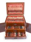 Compuesta por: 15 tenedores de mesa, 12 cuchillos de mesa, 12 cucharas de sopa, 9 tenedores de pescado, 12 palas de pescado, 12 tenedores de postre, 12 cucharas de postre, 12 cucharillas de café.