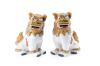 Decorativa pareja de leones de Foo en cerámica esmaltada y vidriada en ocre y blanco, s. XX.