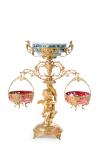 Decorativo centro de mesa con fuste de angelote portante en metal dorado calado y cincelado, flanqueado por cestas colgantes con recipientes en cristal rojo rubí. Remate con cuenco en porcelana china blanca y azul (consolidado).