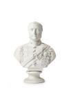 Busto representando a joven militar en biscuit, ataviado con casaca con alamares, botonadura y banda cruzado al pecho con medallón central y venera.