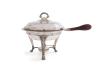 Elegante portafritos en plateado sobre soporte con patas terminadas en garra y asa trenzada. Con mango en madera.