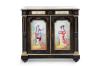 En madera ebonizada, doble puerta frontal con placas de porcelana con decoración de mosquetero y dama con mandolina. Tapa de mármol blanco veteado (con rotura en una esquina).