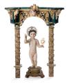 ESCUELA ESPAÑOLA. Siglo XVII - Escultura del Niño Jesús del siglo XVII en madera tallada y policromada, sobre pedestal de madera dorada y policromada, bajo una arquitectura barroca de la segunda mitad del siglo XVII, formada por un arquitrabe y dos columnas salomónicas unidas para formar este conjunto ecléctitico de piezas barrocas.