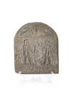 El huecorrelieve presenta una escena de ofrenda. Una figura de la alta sociedad ofrece dos vasos a un dios antropomorfo que sostiene un cuchillo en la mano izquierda y un bastón horizontal en la derecha. El personaje porta un casco azul, como se puede apreciar por los restos de policromía aún existentes, que podría ser una figura relacionada con la realeza. La ofrenda de los vasos Nu formó parte de los ritos preliminares a las ofrendas divinas. La escena está limitada en la parte superior por un Behdety de alas extendidas que delimita el arco del cielo. Este emblema era común en las estelas de la Baja Época Ptolemaica. La parte inferior presenta restos de lo que podría ser escritura jeroglífica, ilegible hoy día por el estado de conservación. En origen, la estela estuvo policromada, como demuestran los restos de pigmento rojo, azul, amarillo y blanco que se aprecia en la superficie.