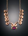 Realizada en oro rosa de 14 k, diseño formado por semi-espirales en cascada terminadas en cuatro espirales; en el centro rematadas por un rubí sintético talla redonda, engastado en grano con un peso estimado de 1.10 cts.