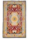 Florón central sobre campo granate cuajada de decoración de flores y cenefa con detalles dorados, mascarones de león, rocallas, tornapuntas y guirnaldas florales.