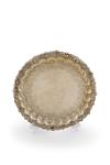 Gran bandeja circular en plata portuguesa punzonada con marcas de Oporto, ley 833, con perímetro de rocallas y rosas. Campo grabado con guirnaldas florales.