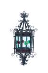 Gran farol antiguo en hierro forjado y recortado con paños en cristal de color.
