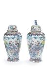 Gran pareja de grandes jarrones globulares con tapa en porcelana de estilo oriental con decoración de flores y aves en rama. Sobre peanas en madera.