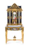 Formado por cuerpo superior con esfera central con numeración romana y mecanismo cuerda a llave, flanqueada por columnas . Decoración, de estilo Sévres, pintada sobre placas de porcelana con los retratos de Luis XVI y Maria Antonieta y remate de cestería calada.