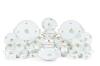 Se compone de: cafetera, jarrita, compotera con tapa rematada por limones, mermeladero con su plato, azucarero (consolidado), bandeja en forma de hoja con asas para dulces o bombones, 2 bandejas circulares con asas para tartas, frutero, huevera, 6 tazas de té con 5 platitos, 5 tazas de café con 6 platitos y 6 platos de merienda.