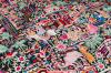 Bordado minuciosamente en seda negra con diseño poco común de inspiración persa-oriental de rico colorido, mostrando una escena narrativa abigarrada con multitud de personajes en arquitecturas y paisajes con palmeras y camellos.