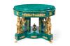Realizada en madera finalizada en símil de malaquita con aplicaciones en bronce dorado. La mesa descansa sobre cuatro pies en forma de esfinges aladas que apoyan sobre basamento circular.
