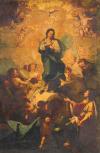 La base de la pintura es la obra de Maella, 130 x 85 cm., conservada en el Museo de Bellas Artes de Valencia y pintada entre 1773-74, una pintura que muestra a La Virgen de la Inmaculada con la alegoría a España, representada con la Real Orden de Carlos III en mano, la cual fue creada por el mismo rey en 1771 y aprobada por el papa Clemente XIV en 1772. Mariano Salvador Maella, recibió junto a Francisco Bayeu, el encargo de decorar la colegiata del Real Sitio de La Granja de San Ildefonso. La obra de Valencia se pensó que podría a ver sido pintada para decorar uno de los altares de la Colegiata del palacio, sin embargo, la documentación de la época ha desmentido tal hipótesis. Este lienzo es en realidad un modellino. Se conservan de este encargo real dos dibujos preparatorios y un par de modellinos previos al lienzo definitivo, con diferencias entre ellos, uno de ellos el del museo valenciano. El cuadro definitivo lo pinto en julio de 1774, donde la presencia de la figura alegórica de España fue sustituida por la imagen de san Frutos, patrón de Segovia. Otras copias se encuentran en una colección privada de Madrid, un dibujo en la Biblioteca Nacional y otra copia en la Concatedral de San Nicolás de Bari de Alicante que seguramente sea de un pintor valenciano del siglo XVIII. La que presentamos aquí, con un estado de conservación de enorme oxidación del barniz, da pie a pensar, que por la calidad de sus formas que podría ser otro modellino desconocido. Presenta aún el bastidor original del siglo XVIII y la tela está sin forrada, y pensamos que no ha sufrido intervenciones muy radicales, con poca pérdida de materia pictórica en su superficie, y que, a pesar del color ambarino y sucio, se pueden apreciar formas muy en sintonía con las obras del pintor valenciano.