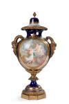Jarrón con tapa de porcelana de Sèvres esmaltada en azul cobalto con detalles en dorado. Francia, S.XIX