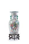 Con decoraciones esmaltadas policromadas y vidriadas de escenas cotidianas en cartelas, motivos vegetales y florales. Asas en forma de leones de Foo. Sobre peana de madera.