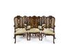 Compuesto por mesa de comedor con alas laterales plegables extensibles, seis sillas y dos butacas con pala calada y respaldo de rejilla. Tapicería bordada con flores en color crudo.