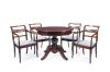 Juego de comedor estilo inglés formado por mesa circular con pata de jarrrón con cuatro pies y cuatro butacas con respaldo calado y patas traseras de sable.